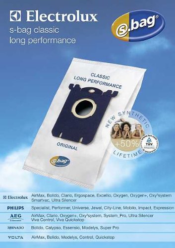s-bag sac aspirateur electrolux e201 b s-bag classic long performance (x4)s bag:le sac synthétique haute performance pour votre aspirateur electrolux!contenu de la pochette: 4 sacs aspirateur s bagnouveau ! durée de vie de 50 % plus longuele s-bag® , un sac à poussière unique pour votre aspirateur electrolux (excellio, clario, oxygen, ultra silencer, ergospace, oxy3system et tous les futurs modèles ! ...).le s-bag® cassic long performance, le sac synthétique qui dure 50 % plus longtemps qu’un sac à poussière ordinaire !le s bag garantit ainsi une excellente performance d'aspiration durant toute sa durée d'utilisation malgré l'effet de remplissage.caractéristiques du s-bag® classic long performance :-durée de vie de plus 50 % : la poussière est absorbée dans le sac s bag sans bloquer les pores, évitant ainsi toute réduction de la puissance d’aspiration. par conséquent, vous n’aurez plus à changer aussi souvent les sacs à poussière.-puissance d’aspiration maximale : le matériau synthétique du s bag assure un débit d’air optimum. il fournira à votre aspirateur une puissance d’aspiration plus constante à mesure que le sac à poussière se remplit. le s bag garantit donc des performances de nettoyage convaincantes sur des périodes plus longues.-excellente capacité de filtration : le matériau synthétique du s bag filtre l’air expulsé de l’aspirateur et recirculé dans la pièce. l’amélioration de la capacité de filtration vous permet d’optimiser vos résultats de nettoyage et d’éliminer les poussières qui se redéposent sur l